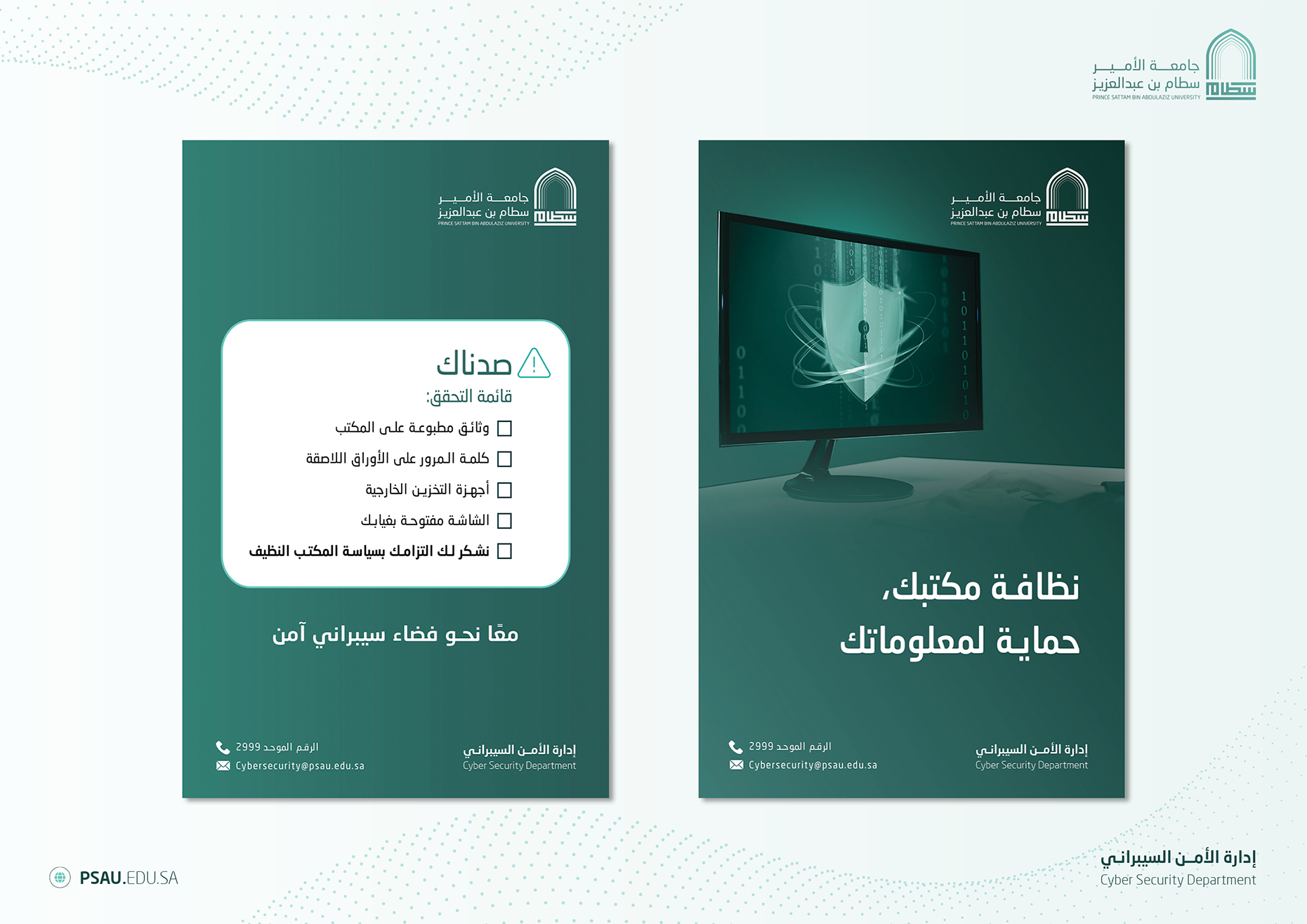 أطلقت إدارة الأمن السيبراني مبادرة "المكتب الآمن والنظيفبهدف تعزيز الوعي الأمني لدى منسوبي الجامعة وتطبيق أفضل الممارسات لحماية المعلومات في بيئة العمل.